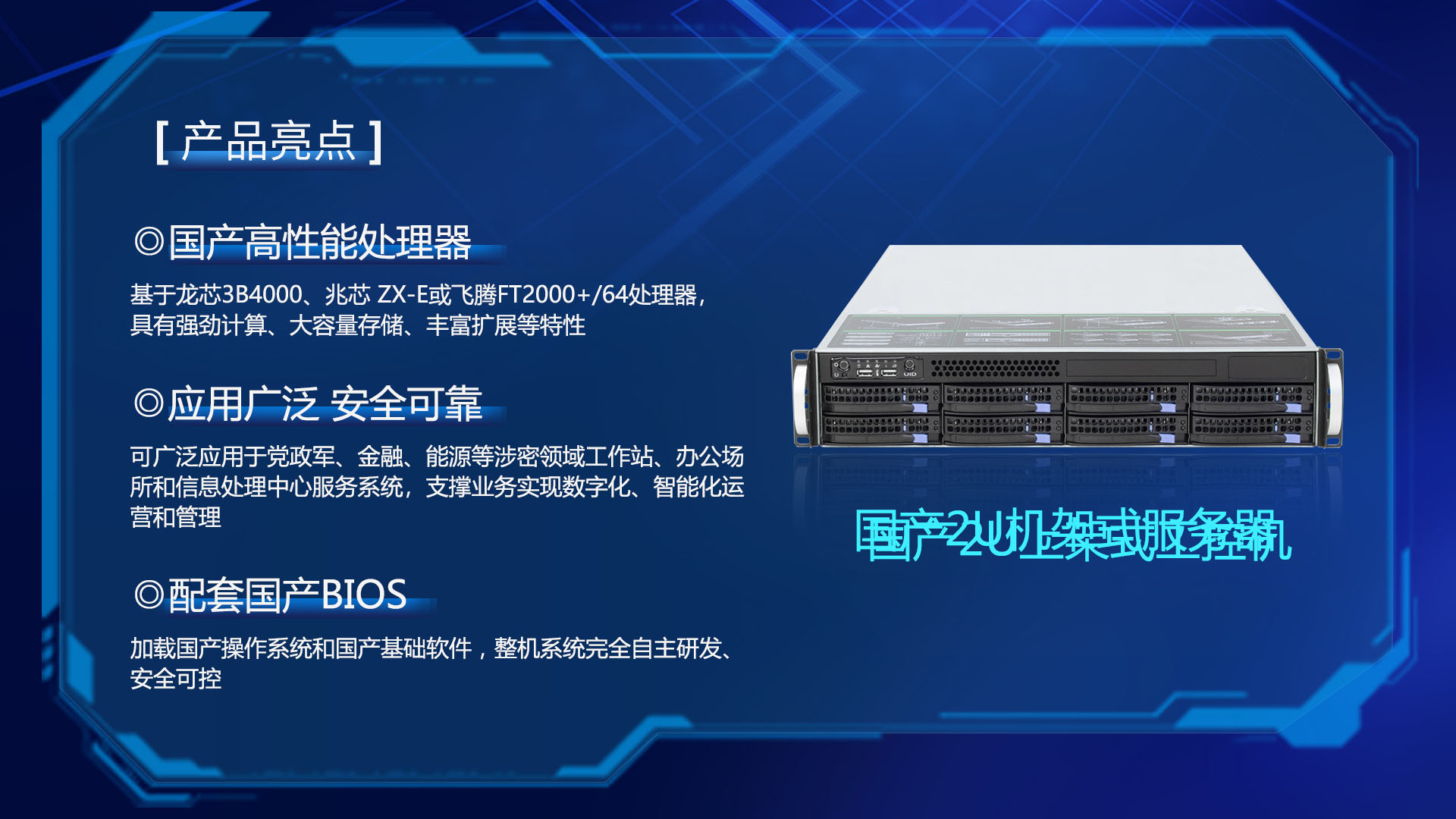 研恒(特控)國(guó)產(chǎn)2U機(jī)架式服務(wù)器基于龍芯3B4000、兆芯 ZX-E或飛騰FT2000+/64處理器,具有強(qiáng)勁計(jì)算、大容量存儲(chǔ)、豐富擴(kuò)展等特性,配套國(guó)產(chǎn)BIOS, 加載國(guó)產(chǎn)操作系統(tǒng)和國(guó)產(chǎn)基礎(chǔ)軟件,整機(jī)系統(tǒng)完全自主研發(fā)、安全可控??蓮V泛應(yīng)用于黨政軍、金融、能源等涉密領(lǐng)域工作站、辦公場(chǎng)所和信息處理中心服務(wù)系統(tǒng),支撐業(yè)務(wù)實(shí)現(xiàn)數(shù)字化、智能化運(yùn)營(yíng)和管理。